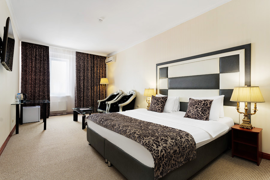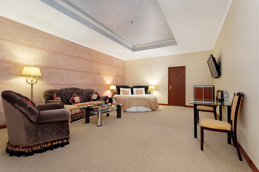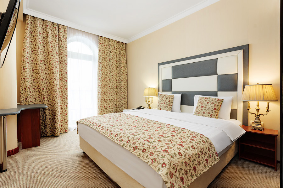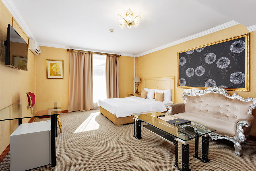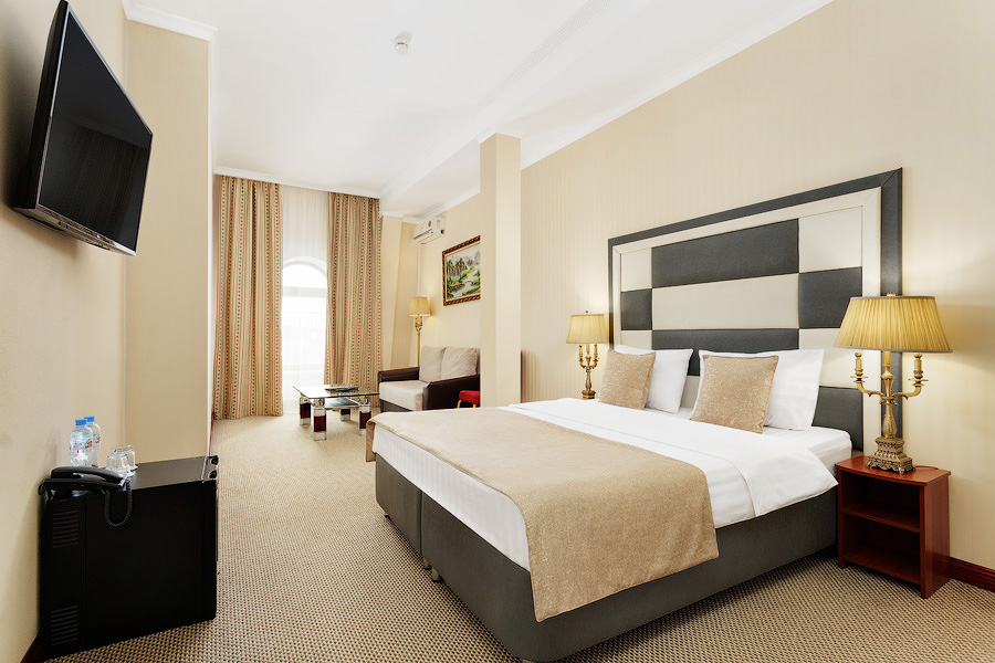 Просторный номер, оформленный в классическом стиле, с выделенными зонами для отдыха и бизнеса. Номера общей площадью от 36 м. кв., выдержаны в теплой цветовой гамме. Ванная комната оснащена ванной или джакузи и феном.