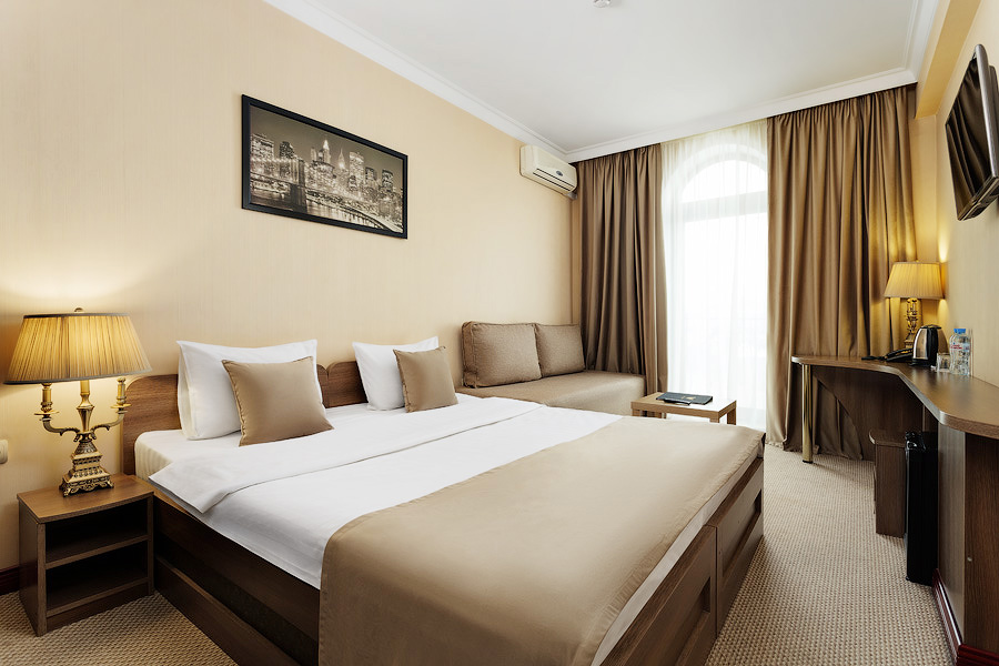 Просторные номера общей площадью от 29 кв.м выполнены в теплых золотисто-бежевых тонах. Этот номер прекрасно подойдёт для гостей, путешествующих с детьми, для которых может быть размещена дополнительная кровать. Ванная комната европейского стандарта оснащена душевой кабиной или ванной.